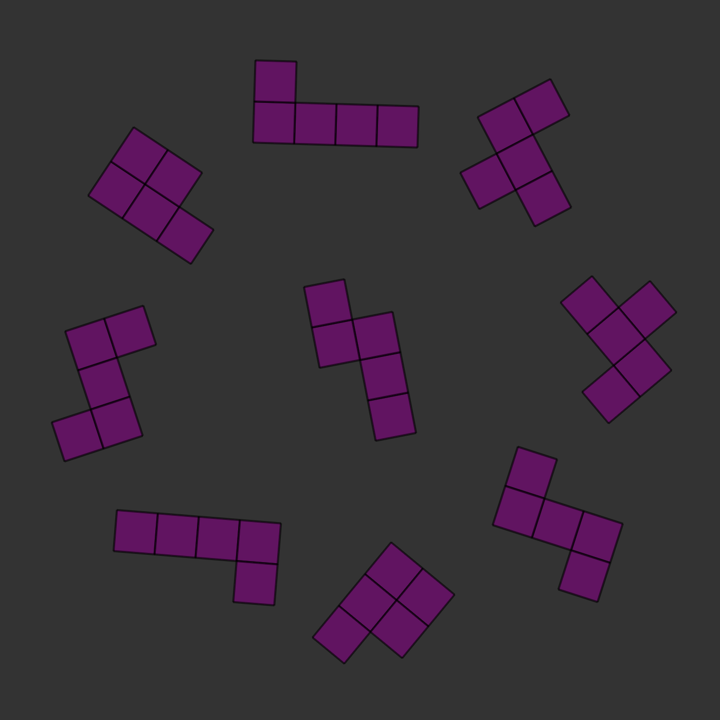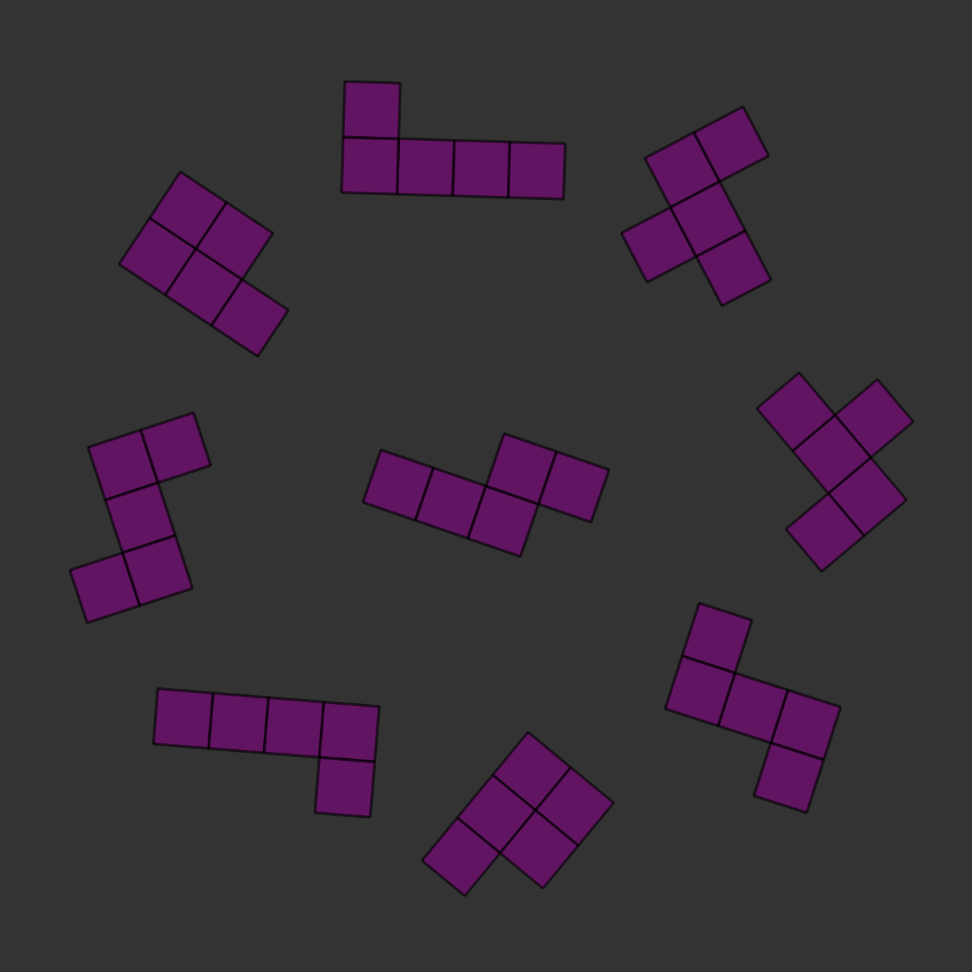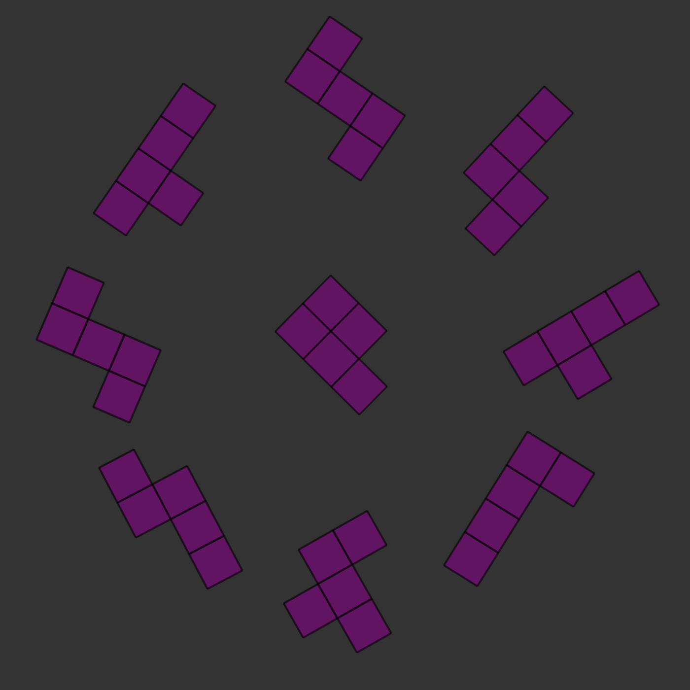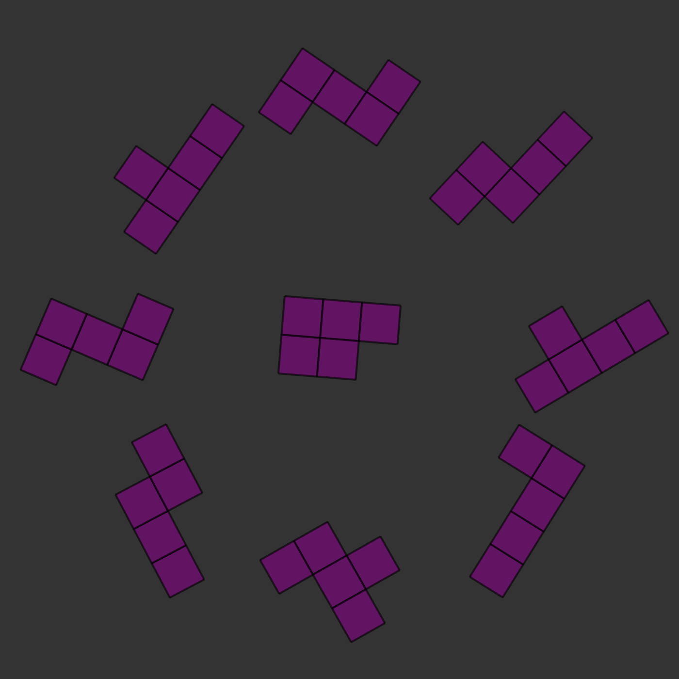 There is one twist: the two images will always be of the same kind of pieces, but they will be rotated and they will sometimes be mirror images of each other. For example, in the images below, you can see that the two central pieces are the same: if you rotated them, they would clearly be identical. In this case, the correct answer would be to press 's', for 'same'.