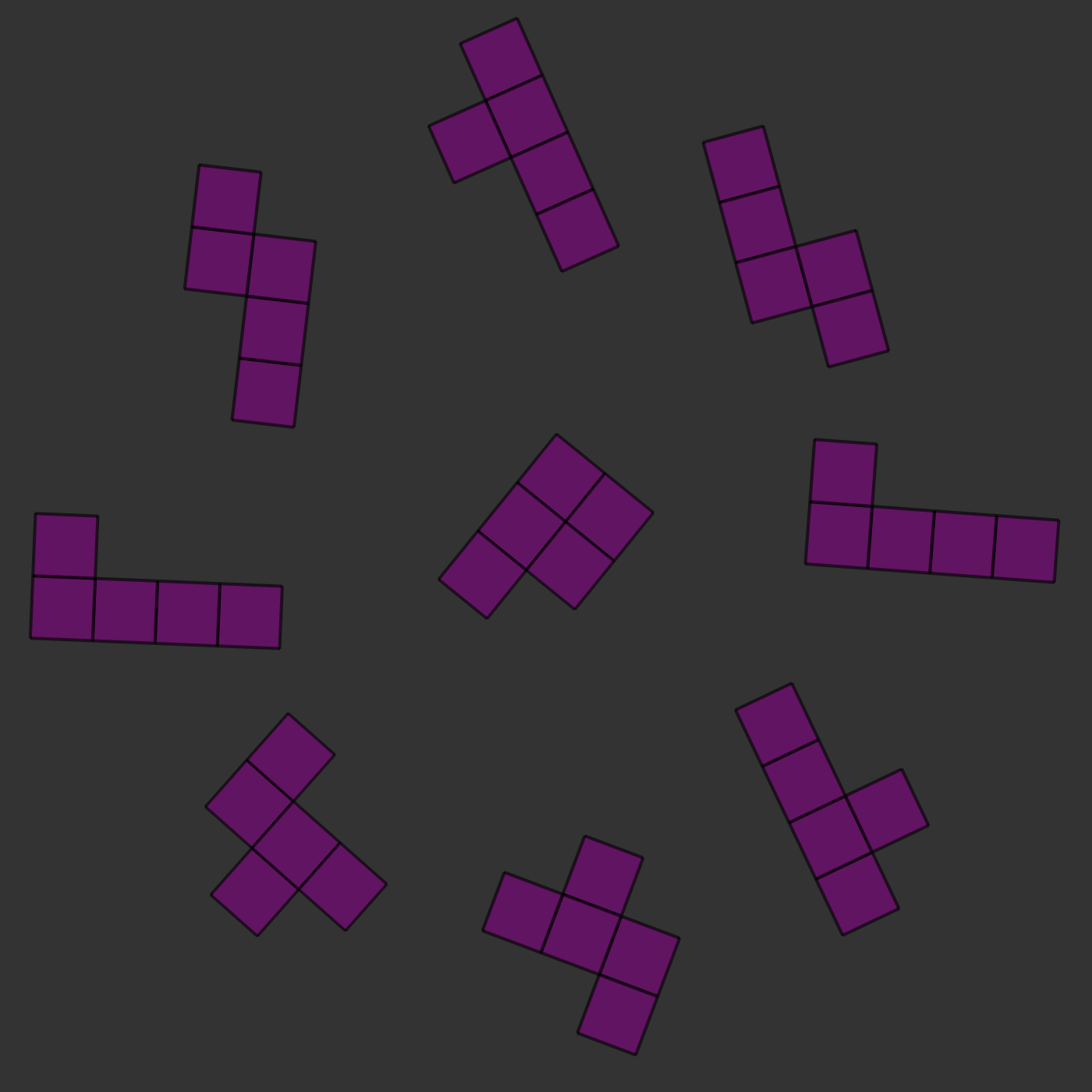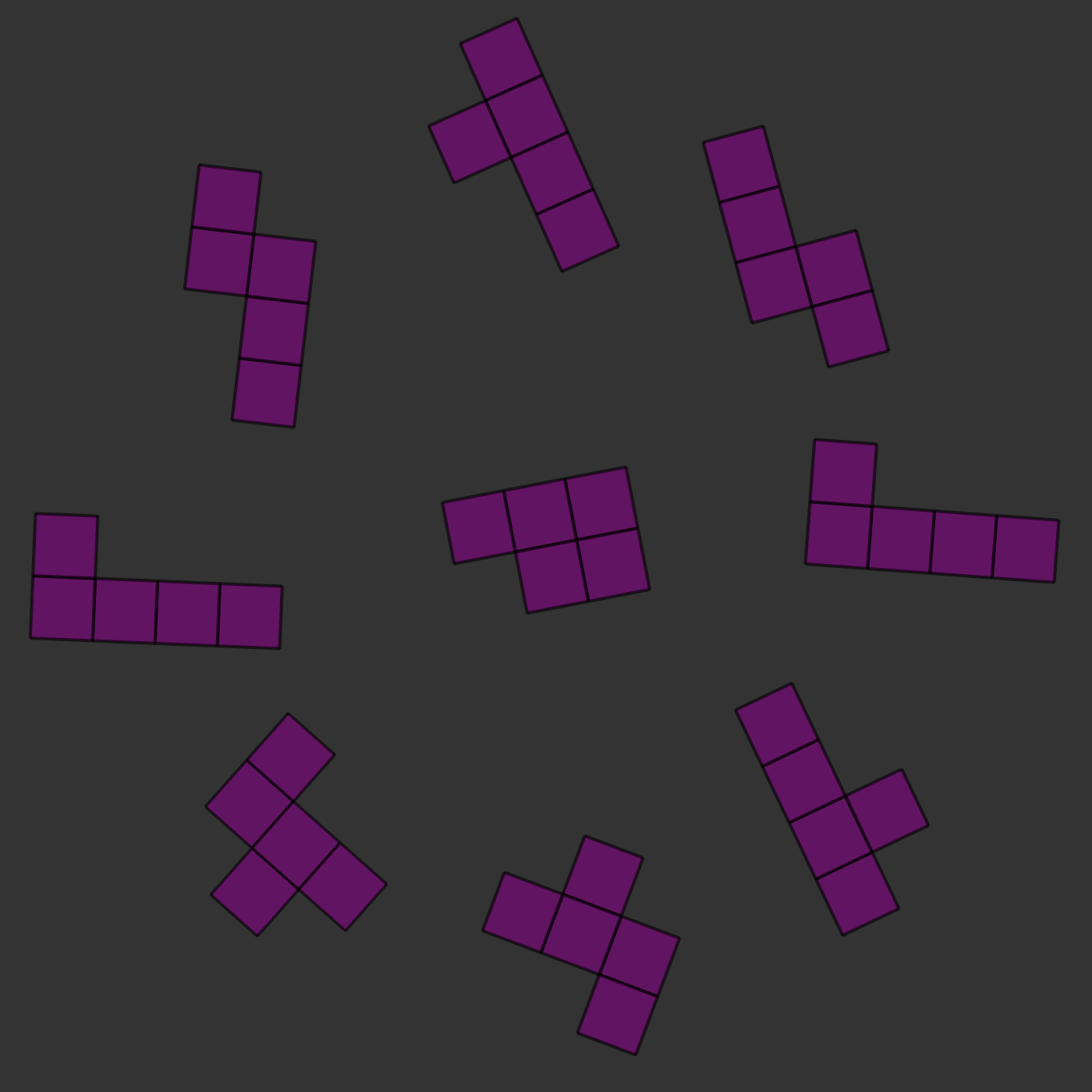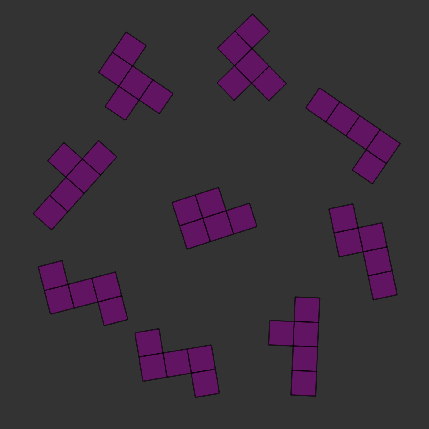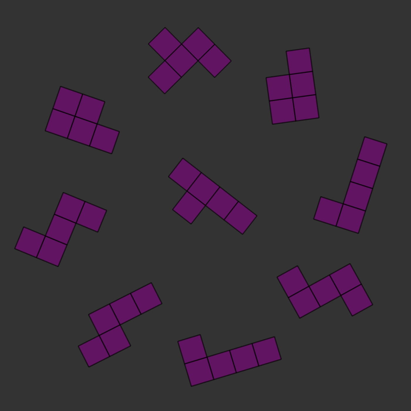 There is one twist: the two images will always be of the same kind of pieces, but they will be rotated and they will sometimes be mirror images of each other. For example, in the images below, you can see that the two central pieces are the same: if you rotated them, they would clearly be identical. In this case, the correct answer would be to press 's', for 'same'.